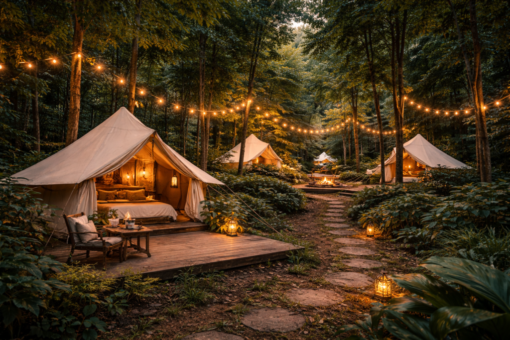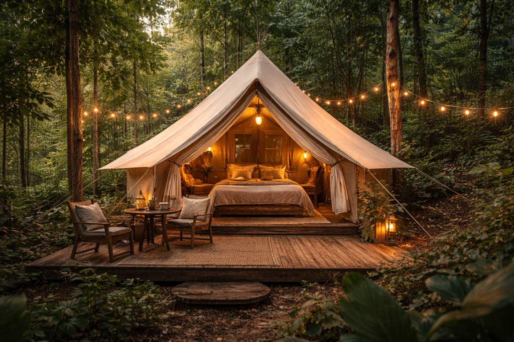 For guests who wish to experience the forest more closely, our glamping grove offers a simple yet beautiful stay surrounded by trees, night sounds, and star-filled skies.