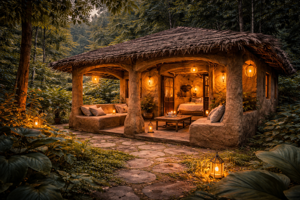 Our mud houses are built using natural earth materials and traditional techniques, designed to stay cool in the summer and warm in the misty hill evenings. Each stay includes a private verandah, simple handcrafted interiors, and views of the surrounding forest and valley.